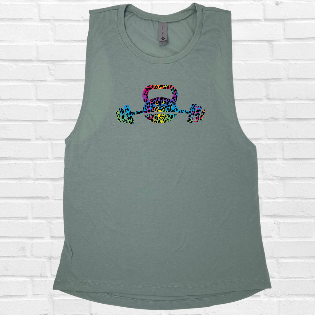 Kettlebell Tank in Rainbow Leopard Graphics.